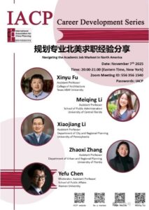 On October 17, the International Association for China Planning (IACP) held an online professional development webinar titled “Navigating the Academic Job Market in North American Planning Schools.” The session was opened by Dr. Zhenhua Chen, Associate Professor at The Ohio State University and Chair-Elect of IACP, and moderated by Dr. Yefu Chen, Assistant Professor at …