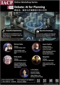 Join us for an enlightening online debate hosted by IACP on January 22, 2025, from 10:30 AM to 12:00 PM EST. The debate will explore the application of Artificial Intelligence (AI) in urban and regional planning, a pivotal topic in city development. Our esteemed panel includes Professor Michael Batty from University College London, an expert …